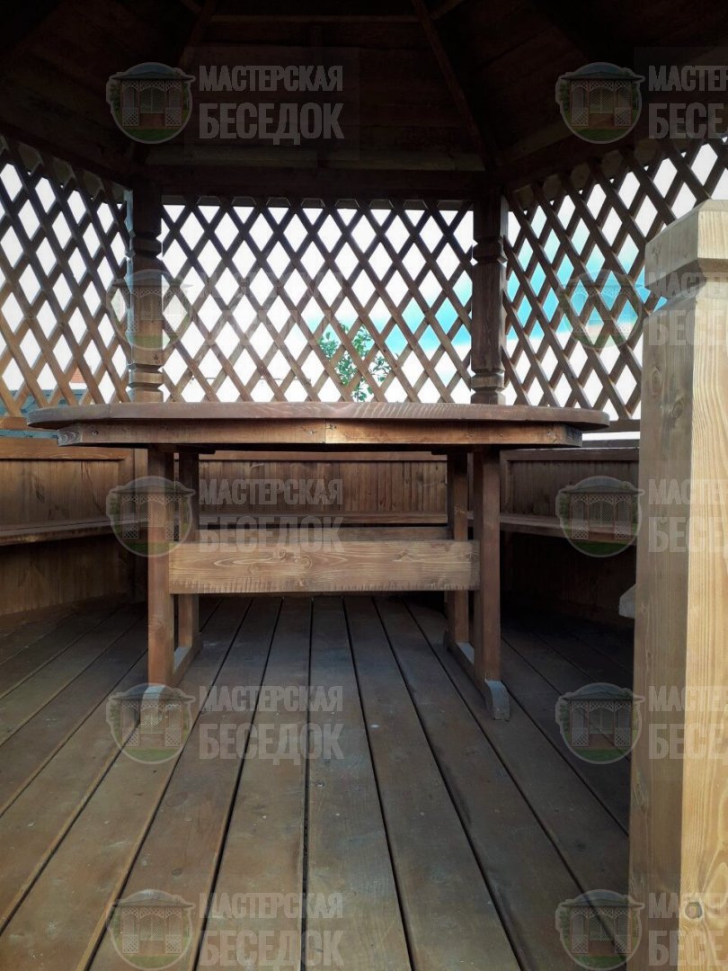Деревянная беседка “Богатырская” это мощь и сила дерева! Резные столбы придают этой беседке Русский Стиль и Русский Дух. Вся конструкция выполнена их сухих материалов камерной сушки. Только в таком случае беседка (и ее пропитка) будет служить Вам долго. На нашем производстве возможны любые модификации и изменения размеров и дизайна.