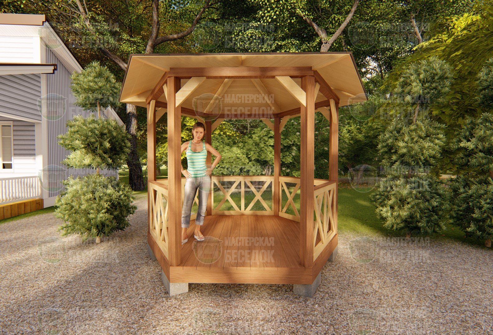 Деревянная беседка “Московская Жара” простая, но в то же время стильная беседка с ограждениями в виде перекрестий и массивными деревянными столбами. В такую беседку мы можем дополнительно изготовить и смонтировать деревянные лавки по периметру.