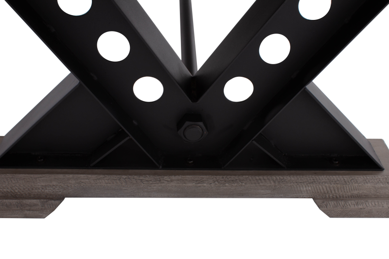 Стол сделан из древесины твердых пород с металлической рамой.