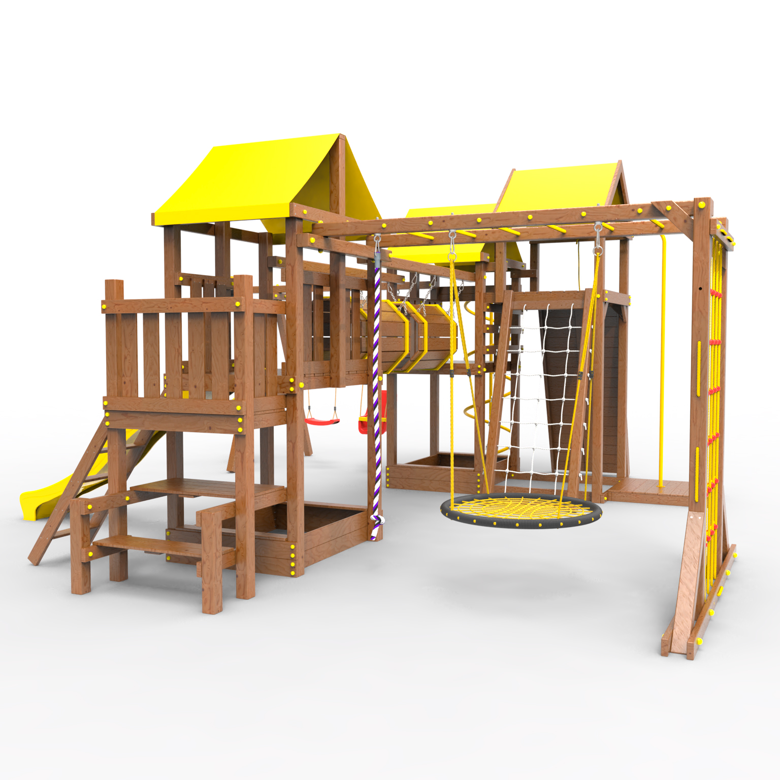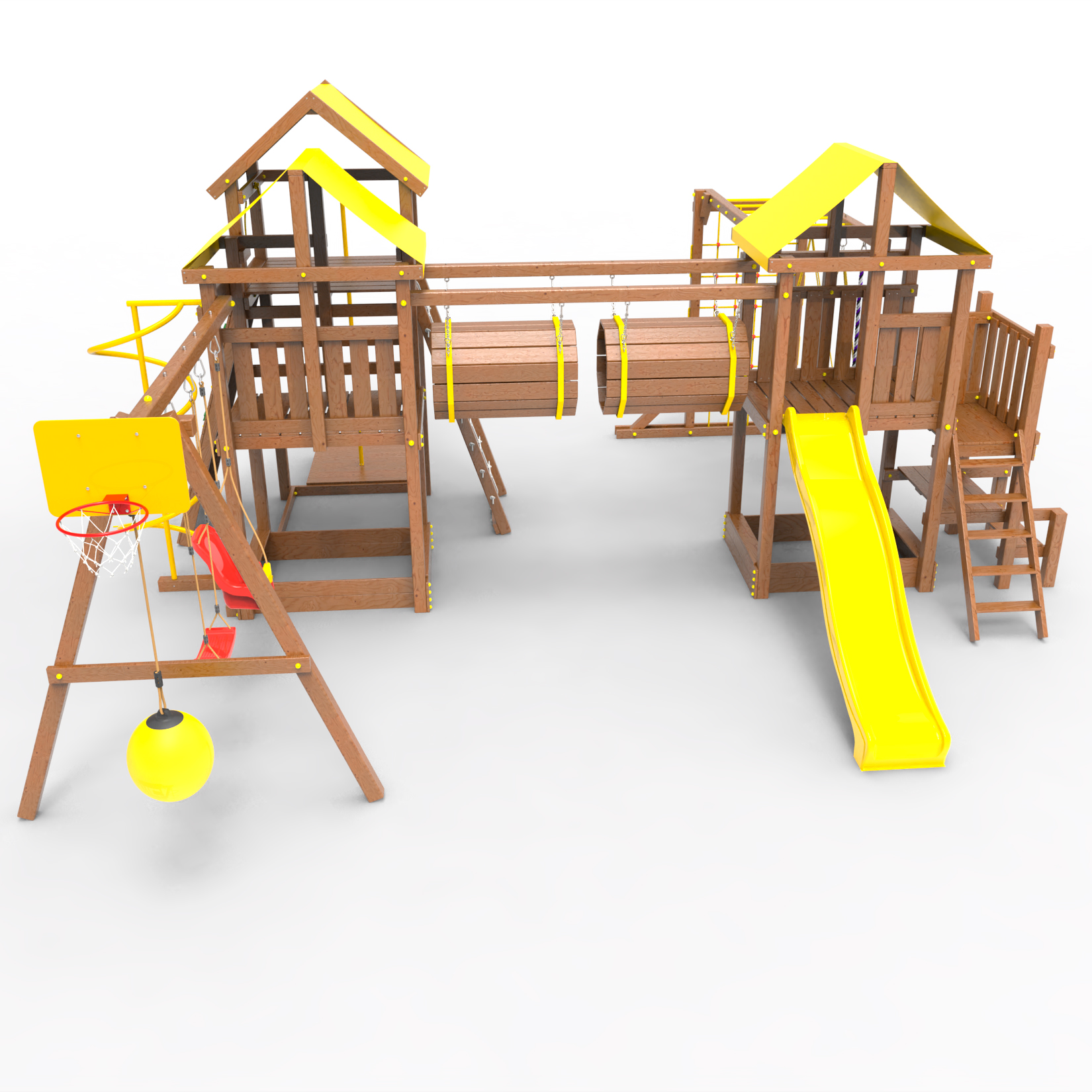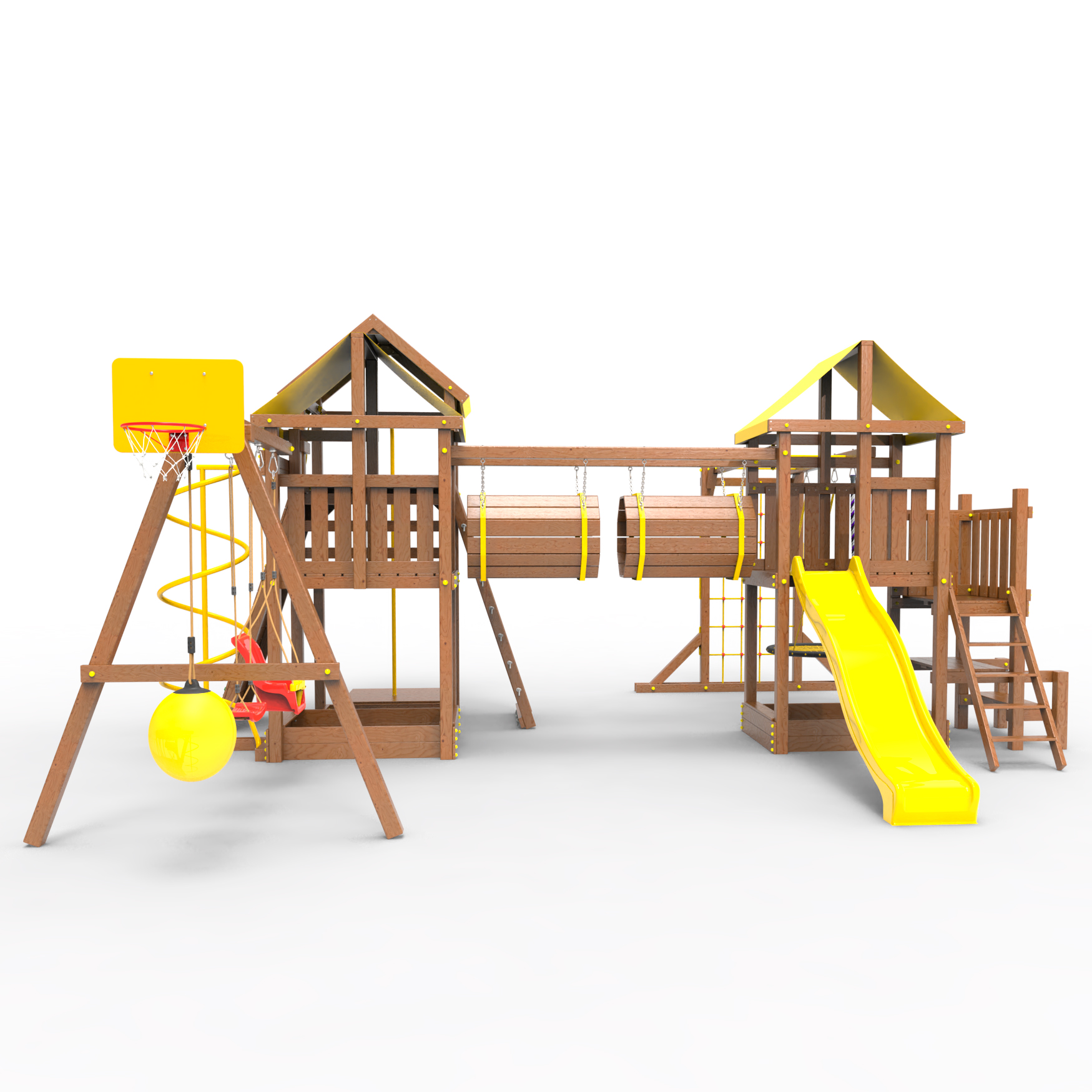 Два домика|Песочница|Лестница|Шторм-трап|Скалодром|Рукоход|Шведская стенка|Турник|Руфер|Баскетбольная корзина|Мостик|Горка|Спираль|Волна|Сеть для лазания|Качели |