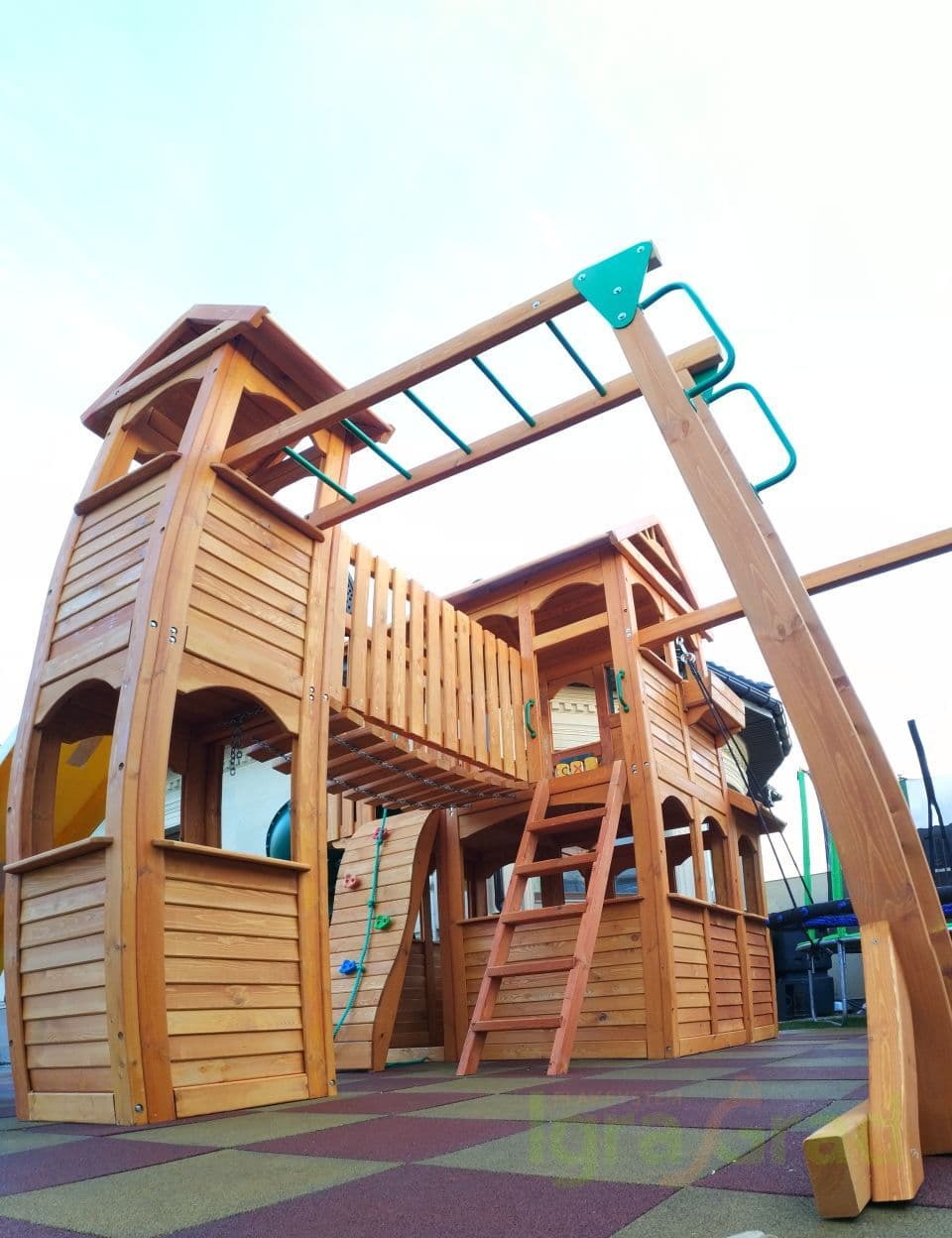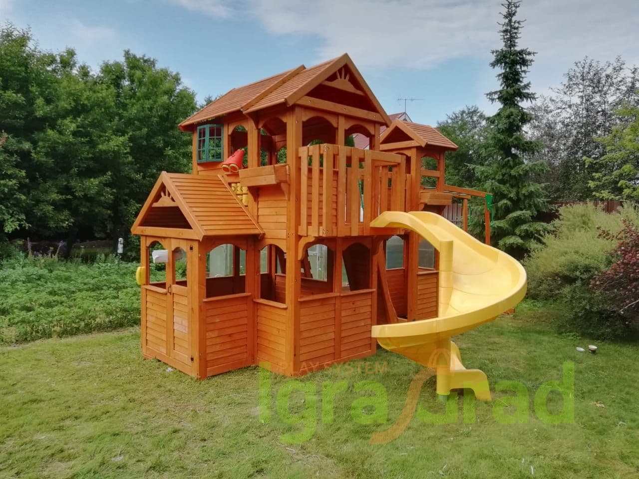 - отдельно стоящий дополнительный двухуровневый домик с деревянной крышей;