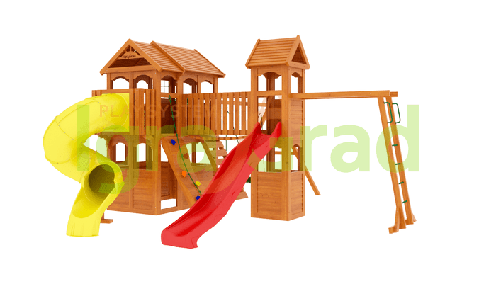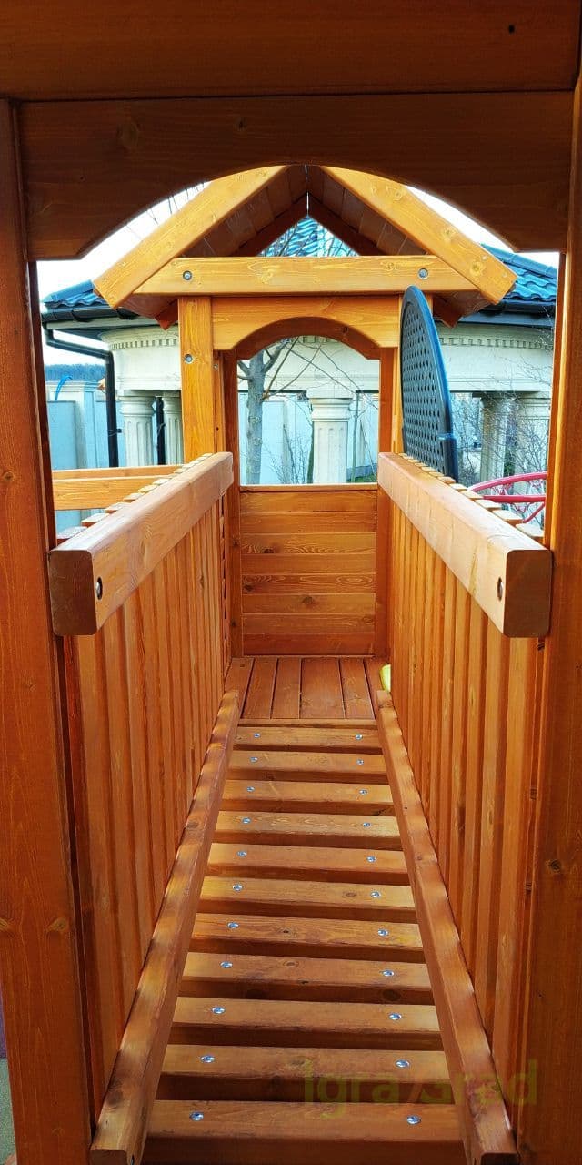 - Закрытый двухуровневый игровой домик с дверью, деревянной крышей;