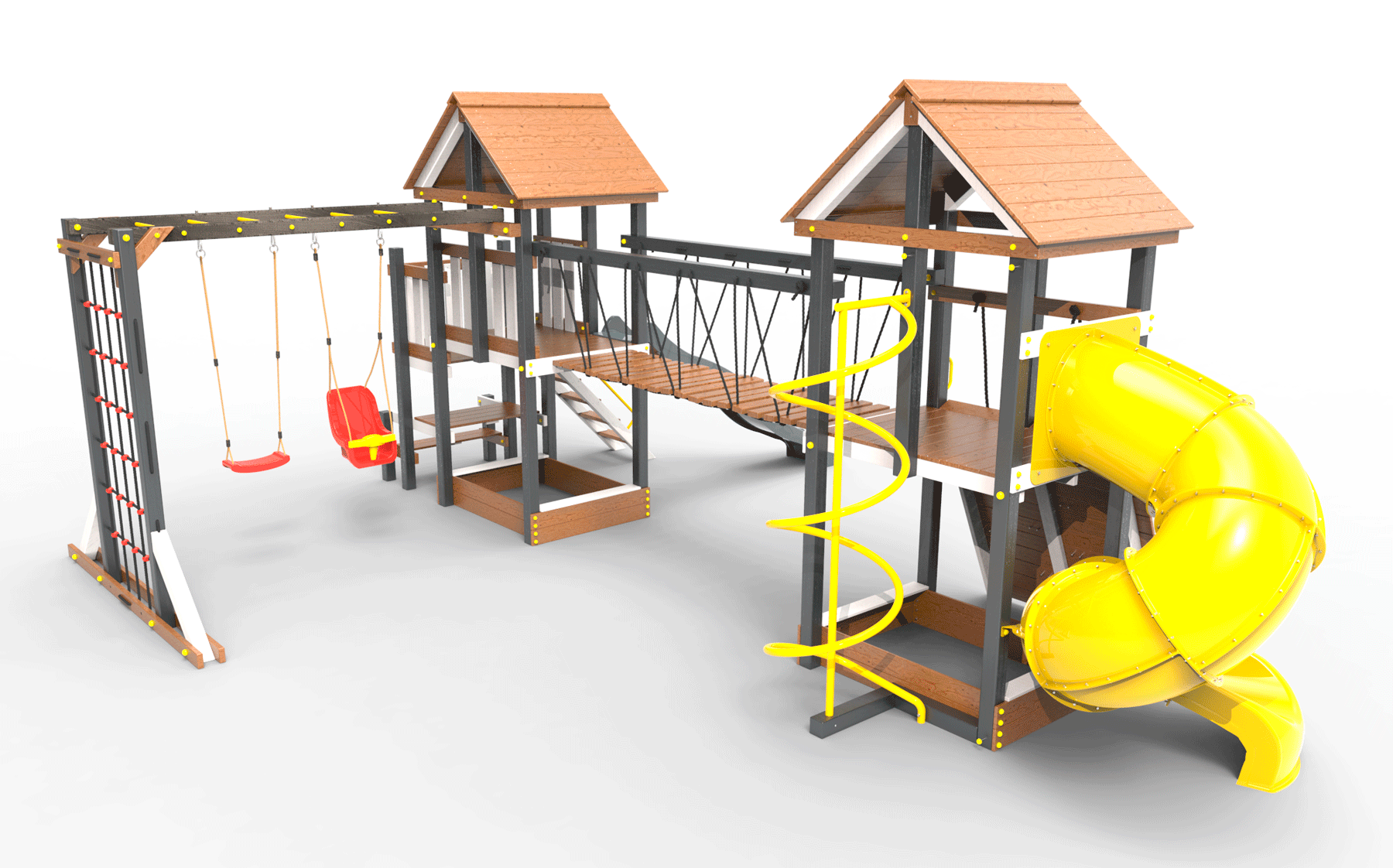 Обращаем Ваше внимание, что фактический цвет детской площадки может отличаться от представленных фото на сайте. Специфика окраски нетоксичными пропитками и красителями допускает отклонения в цветовой гамме отгружаемых изделий. Также обратите внимание, что фактический цвет может отличаться из-за цветопередачи устройства на котором Вы смотрите фото. Производитель оставляет за собой право менять цвет отдельных деталей и комплектующих(включая пластик, канаты и пр.), при этом сохраняя весь функционал и характеристики товара.