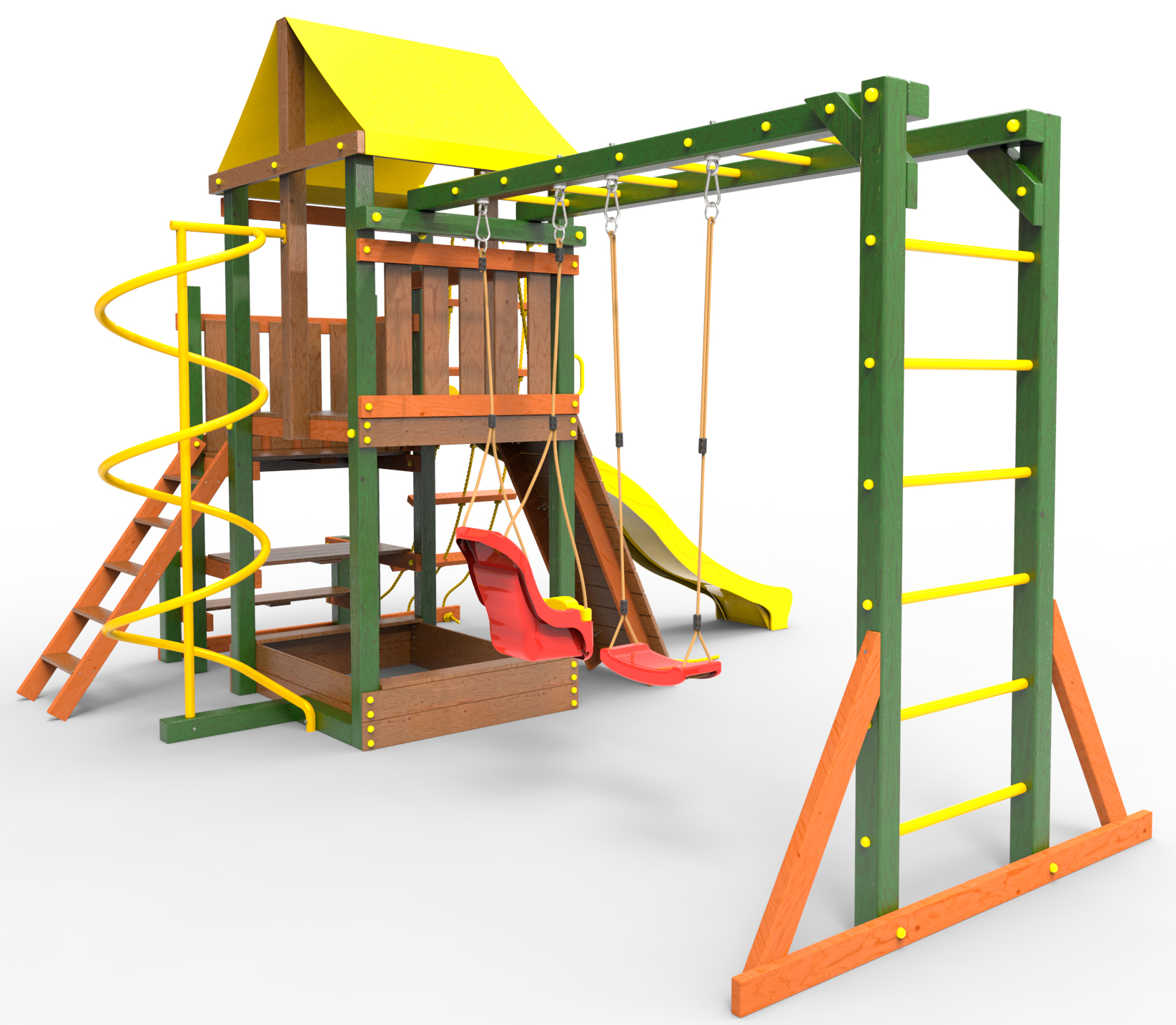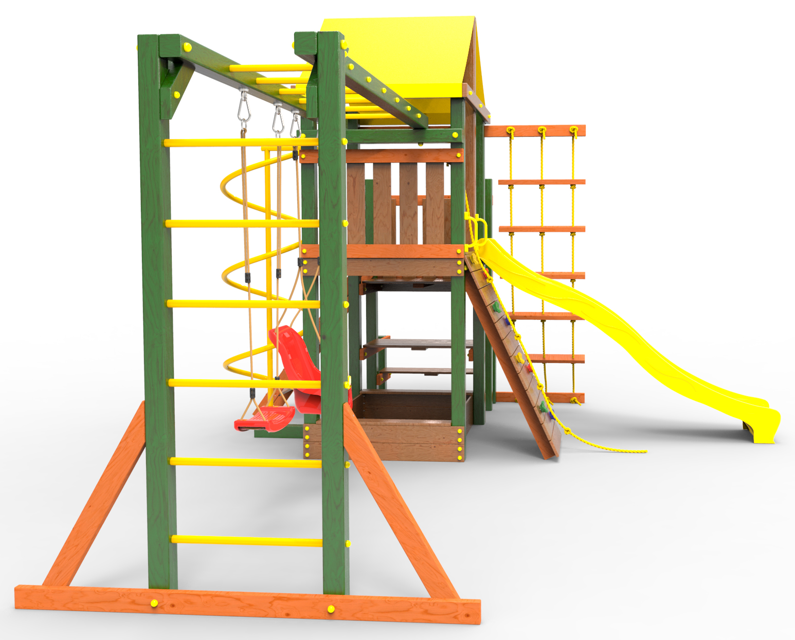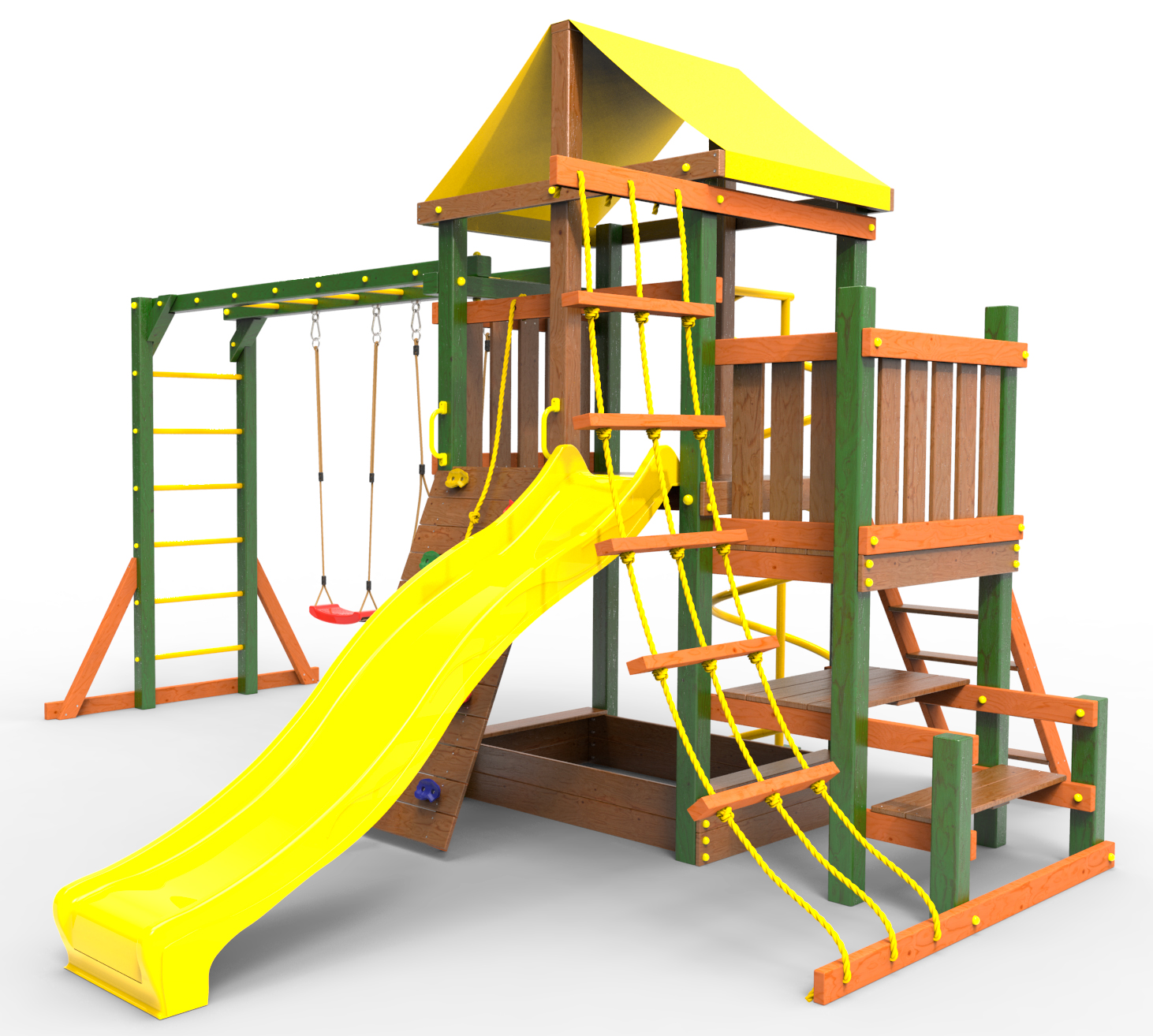 ● деревянная крыша ● трап 2м с канатом ● поручни для лестницы ● диван на цепях двухместный ● столик в песочницу