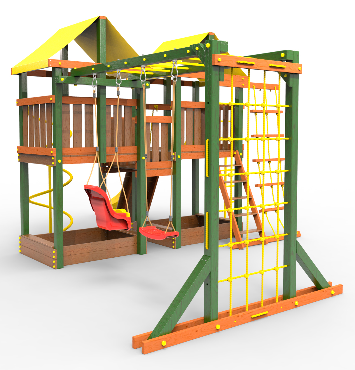 Все столбы и качельная балка площадки выполнена из высокопрочного клеёного бруса камерной сушки сечением 90х90мм.