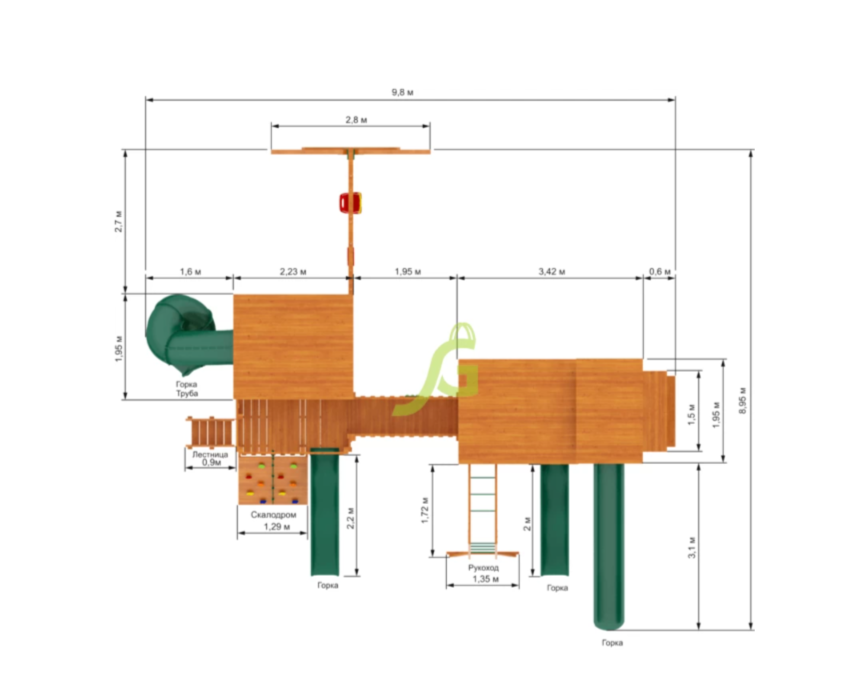 - - клеенный брус и обработанное специальными составами дерево устойчиво к внешним воздействиям и не боится влаги, поэтому комплекс будет радовать взрослых и детей безупречным внешним видом ни один сезон;
