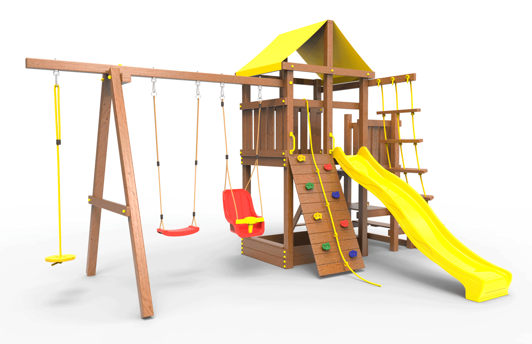 ● деревянная крыша ● трап 2м с канатом ● поручни для лестницы ● диван на цепях двухместный ● столик в песочницу