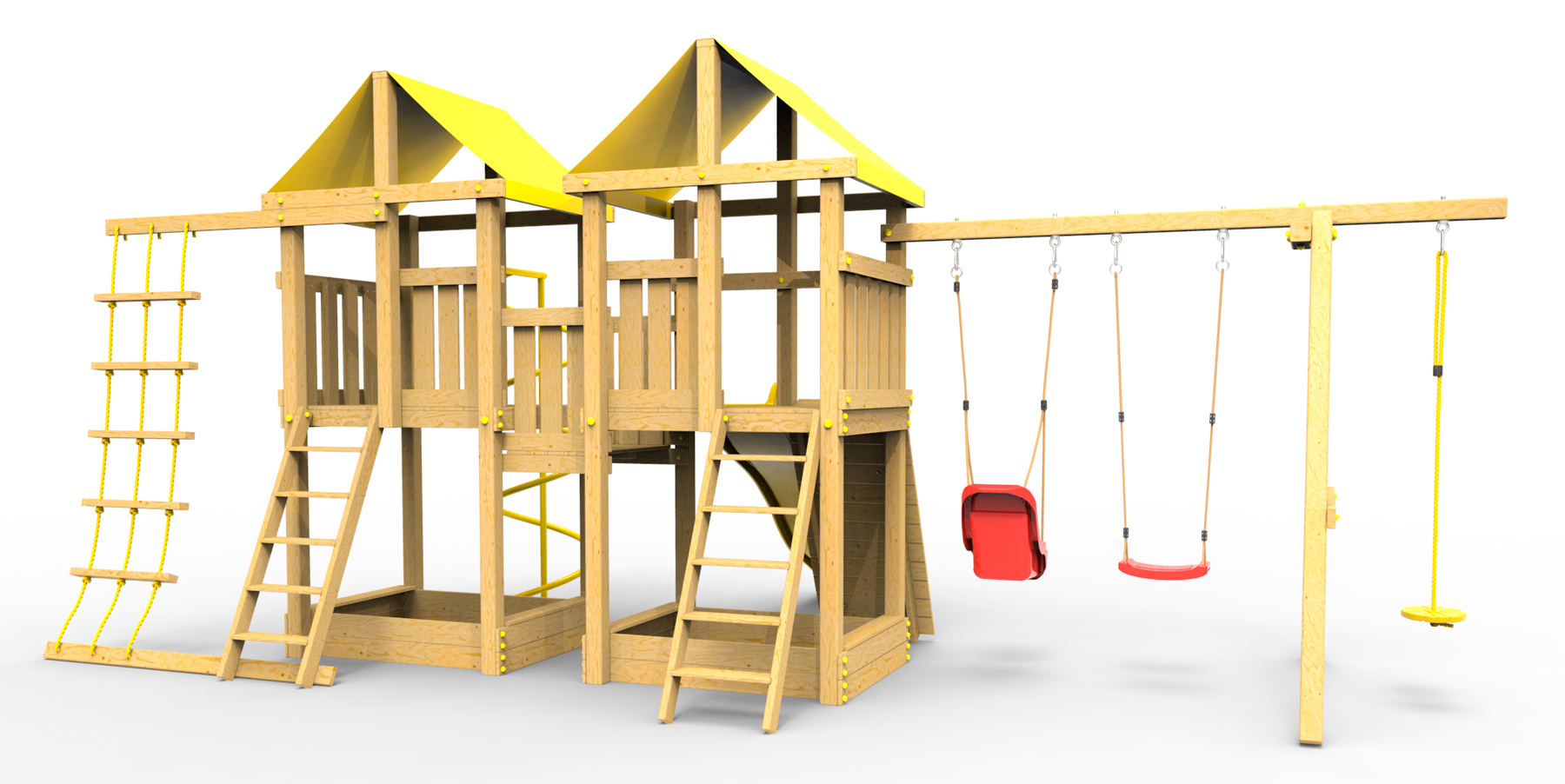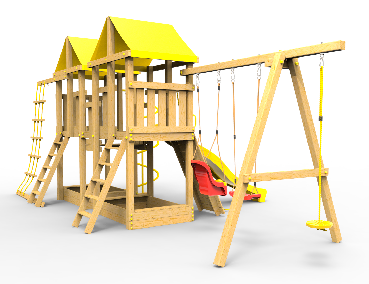 Все столбы и качельная балка площадки выполнена из высокопрочного клеёного бруса камерной сушки сечением 90х90мм.