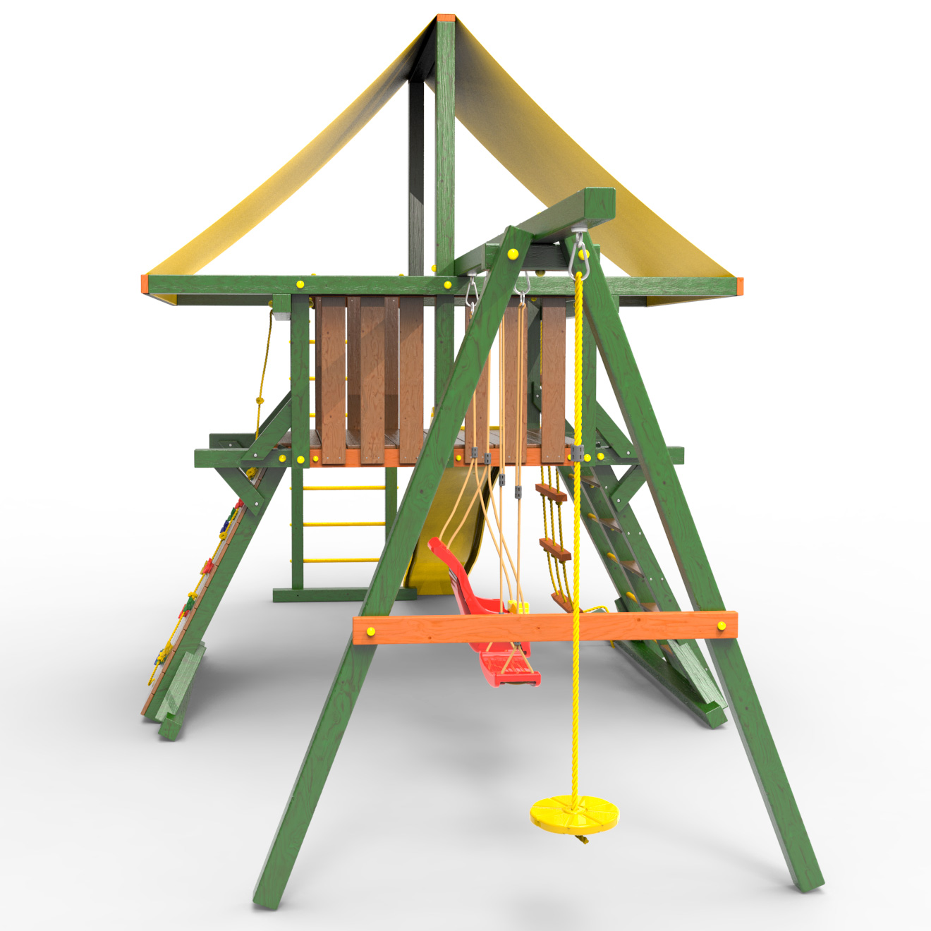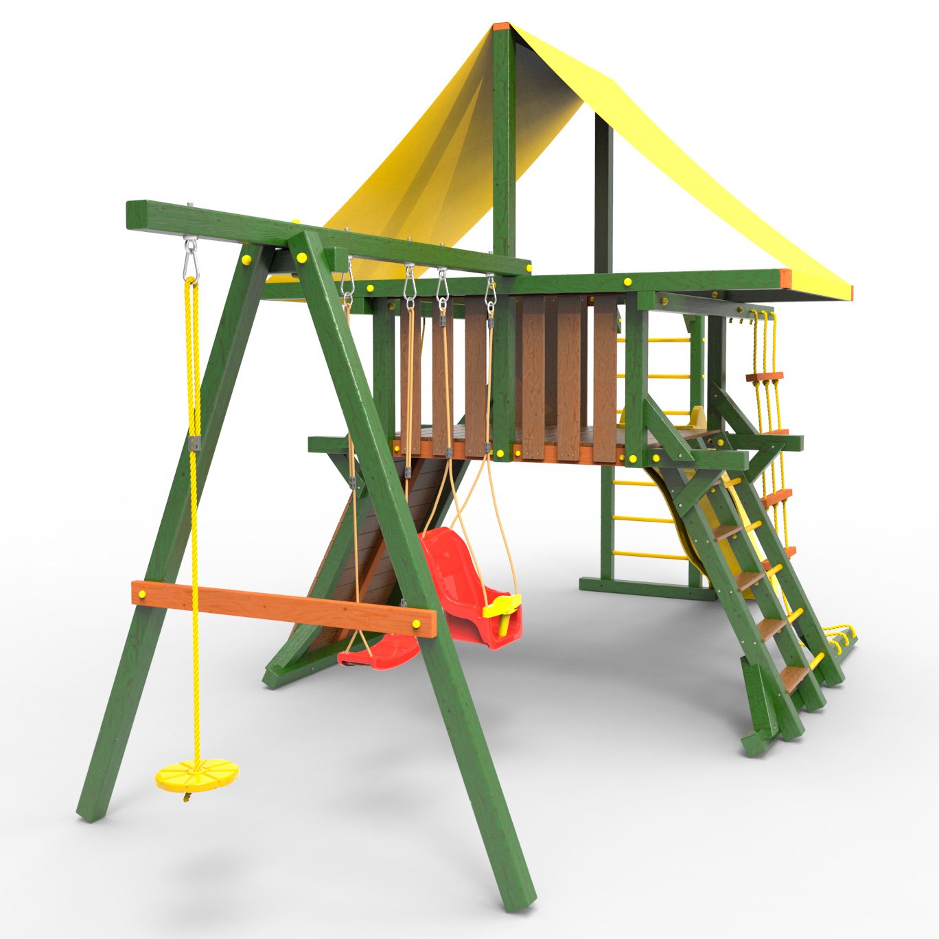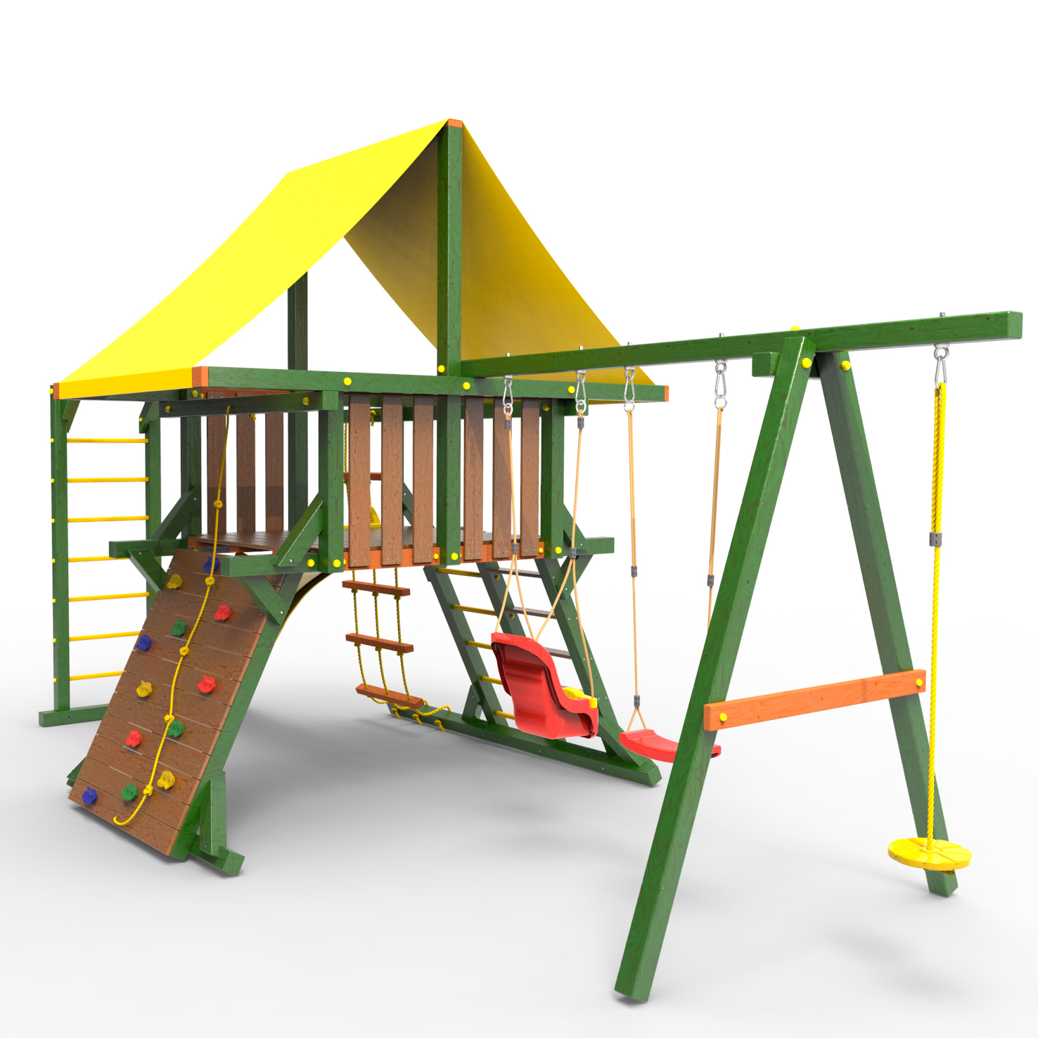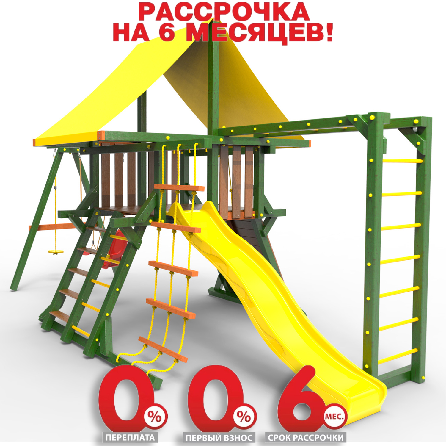 Обращаем Ваше внимание, что фактический цвет детской площадки может отличаться от представленных фото на сайте. Специфика окраски нетоксичными пропитками и красителями допускает отклонения в цветовой гамме отгружаемых изделий. Также обратите внимание, что фактический цвет может отличаться из-за цветопередачи устройства на котором Вы смотрите фото. Производитель оставляет за собой право менять цвет отдельных деталей и комплектующих(включая пластик, канаты и пр.), при этом сохраняя весь функционал и характеристики товара.