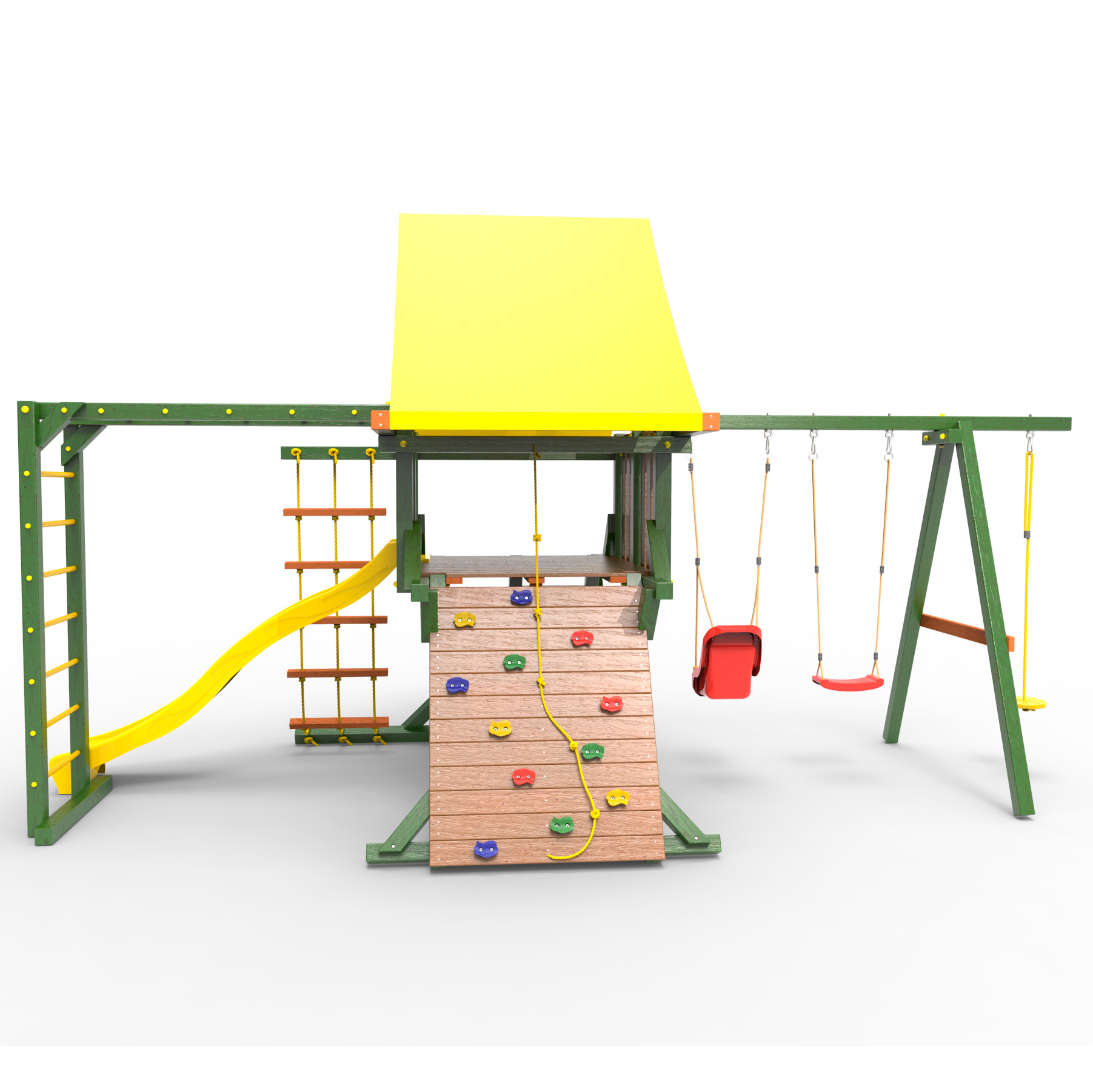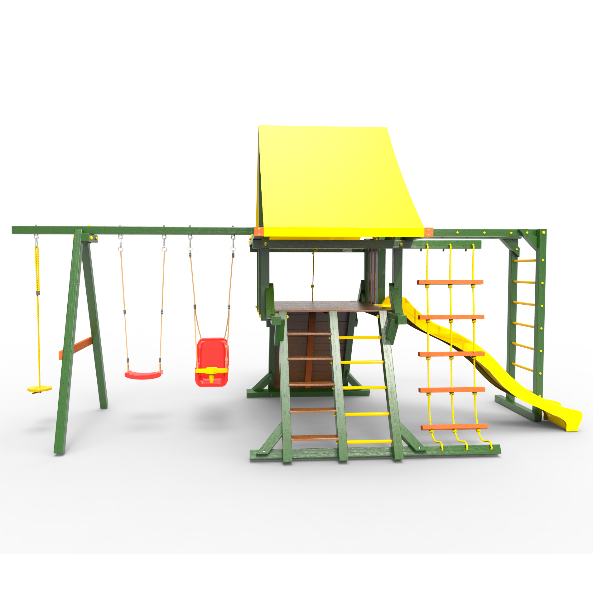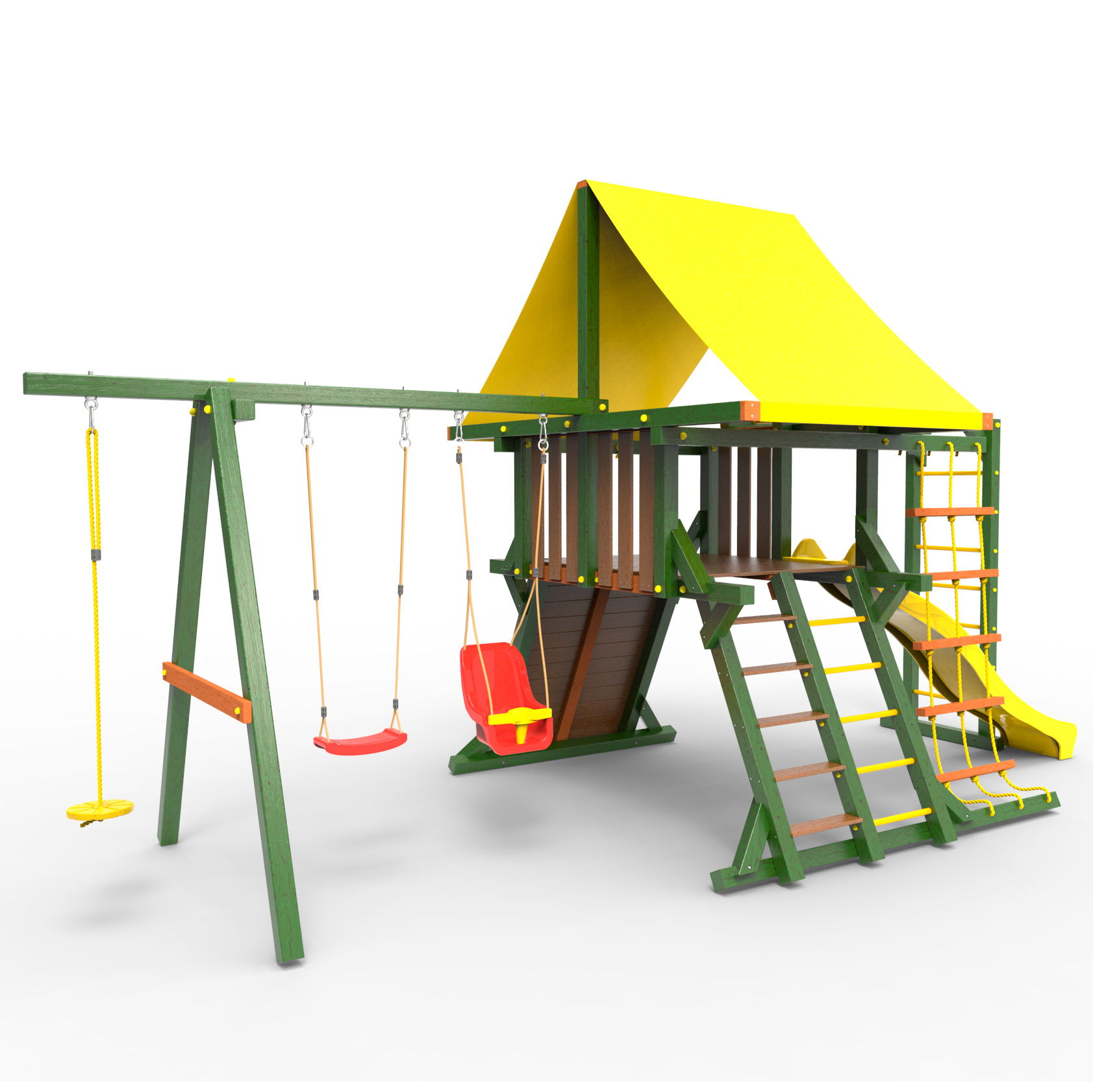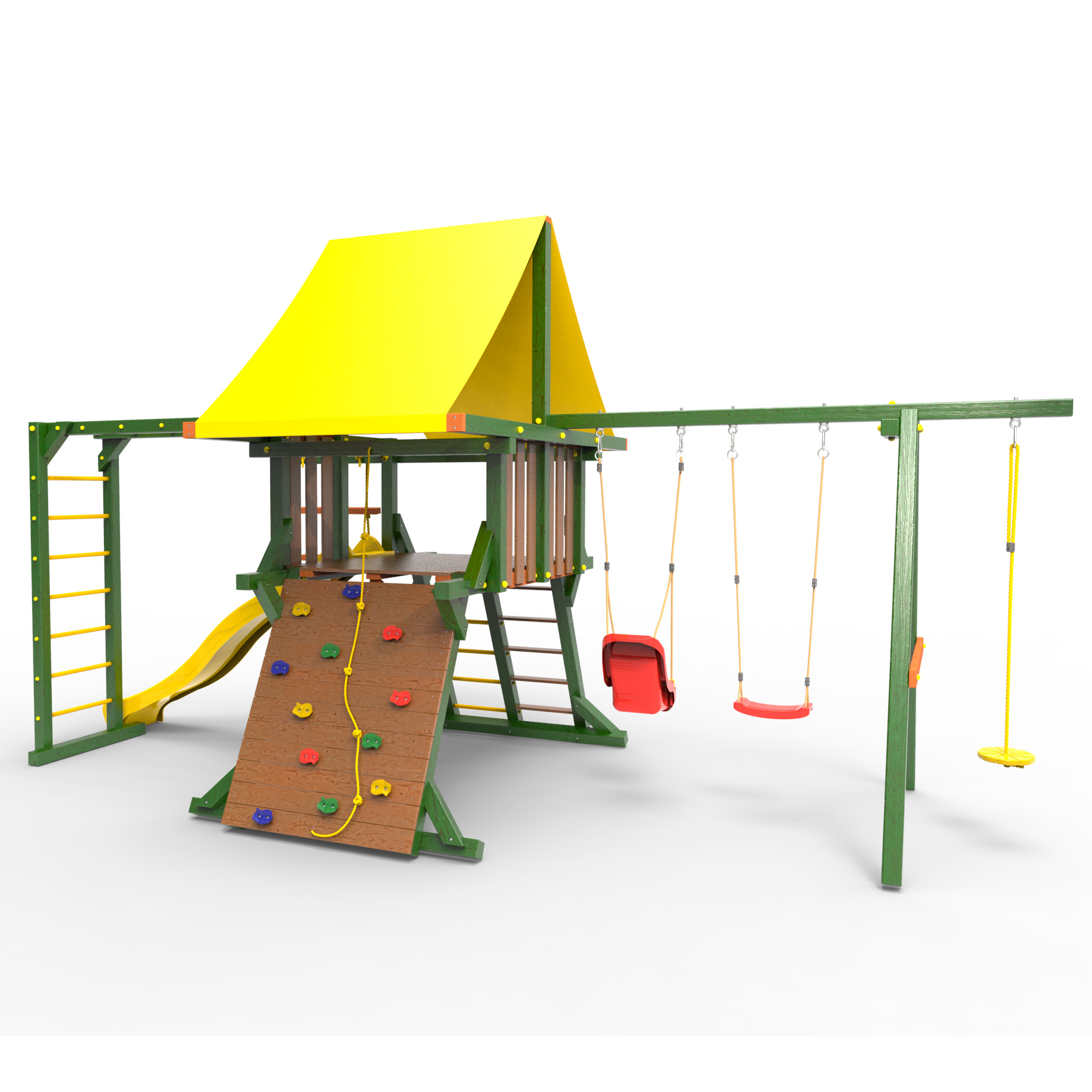Обращаем Ваше внимание, что фактический цвет детской площадки может отличаться от представленных фото на сайте. Специфика окраски нетоксичными пропитками и красителями допускает отклонения в цветовой гамме отгружаемых изделий. Также обратите внимание, что фактический цвет может отличаться из-за цветопередачи устройства на котором Вы смотрите фото. Производитель оставляет за собой право менять цвет отдельных деталей и комплектующих(включая пластик, канаты и пр.), при этом сохраняя весь функционал и характеристики товара.
