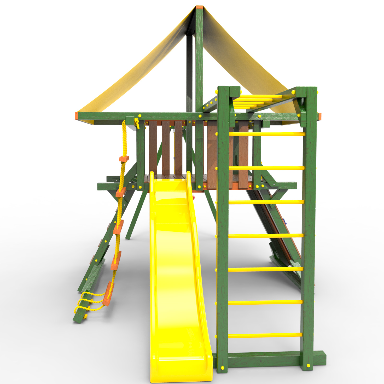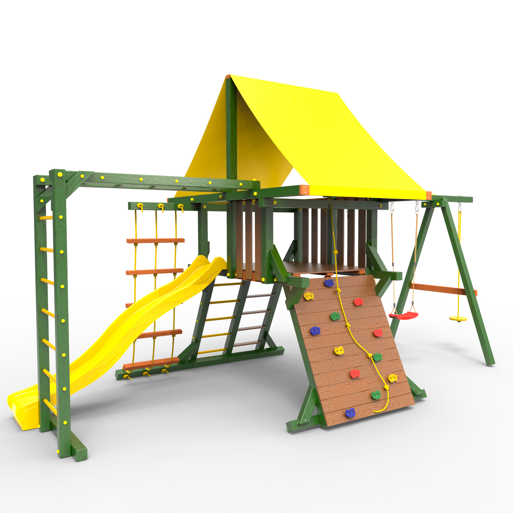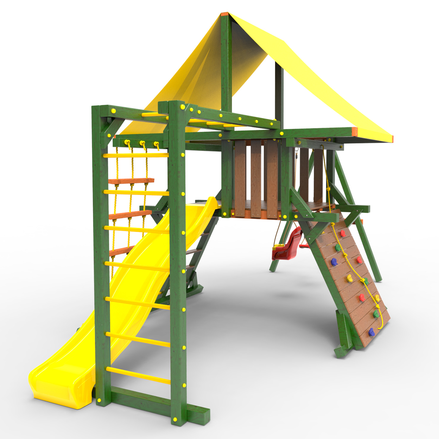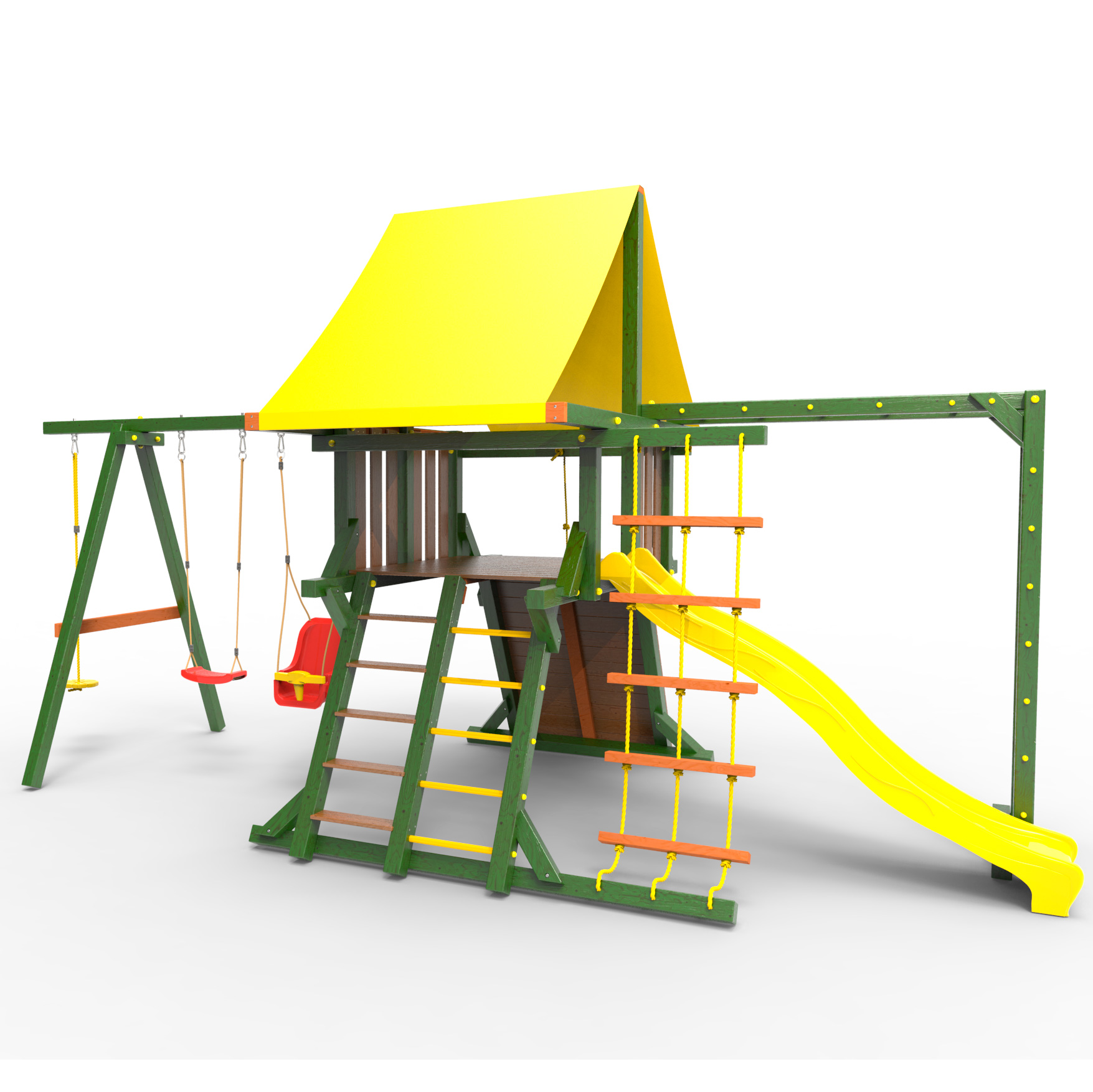 Обращаем Ваше внимание, что фактический цвет детской площадки может отличаться от представленных фото на сайте. Специфика окраски нетоксичными пропитками и красителями допускает отклонения в цветовой гамме отгружаемых изделий. Также обратите внимание, что фактический цвет может отличаться из-за цветопередачи устройства на котором Вы смотрите фото. Производитель оставляет за собой право менять цвет отдельных деталей и комплектующих(включая пластик, канаты и пр.), при этом сохраняя весь функционал и характеристики товара.