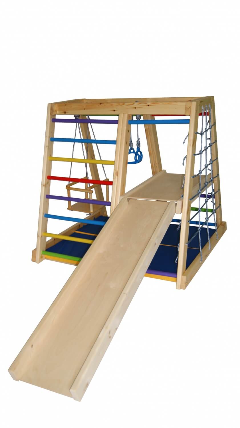 - максимальная комплектация включает в себя шведские стенки, рукоход, сеть для лазанья, страховочный мат, качели, гимнастические кольца, а также горку с удобной площадкой.