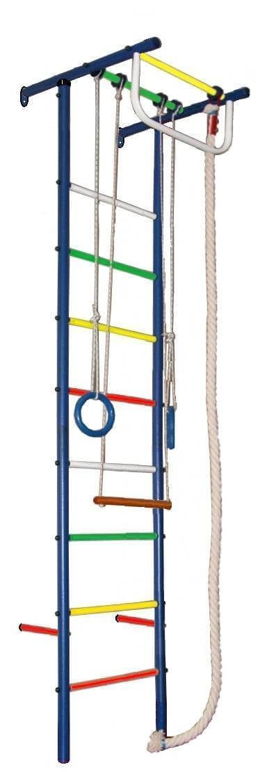 Комплектация: шведская стенка, цветные перекладины, узким хватом турник, кольца, канат, трапеция