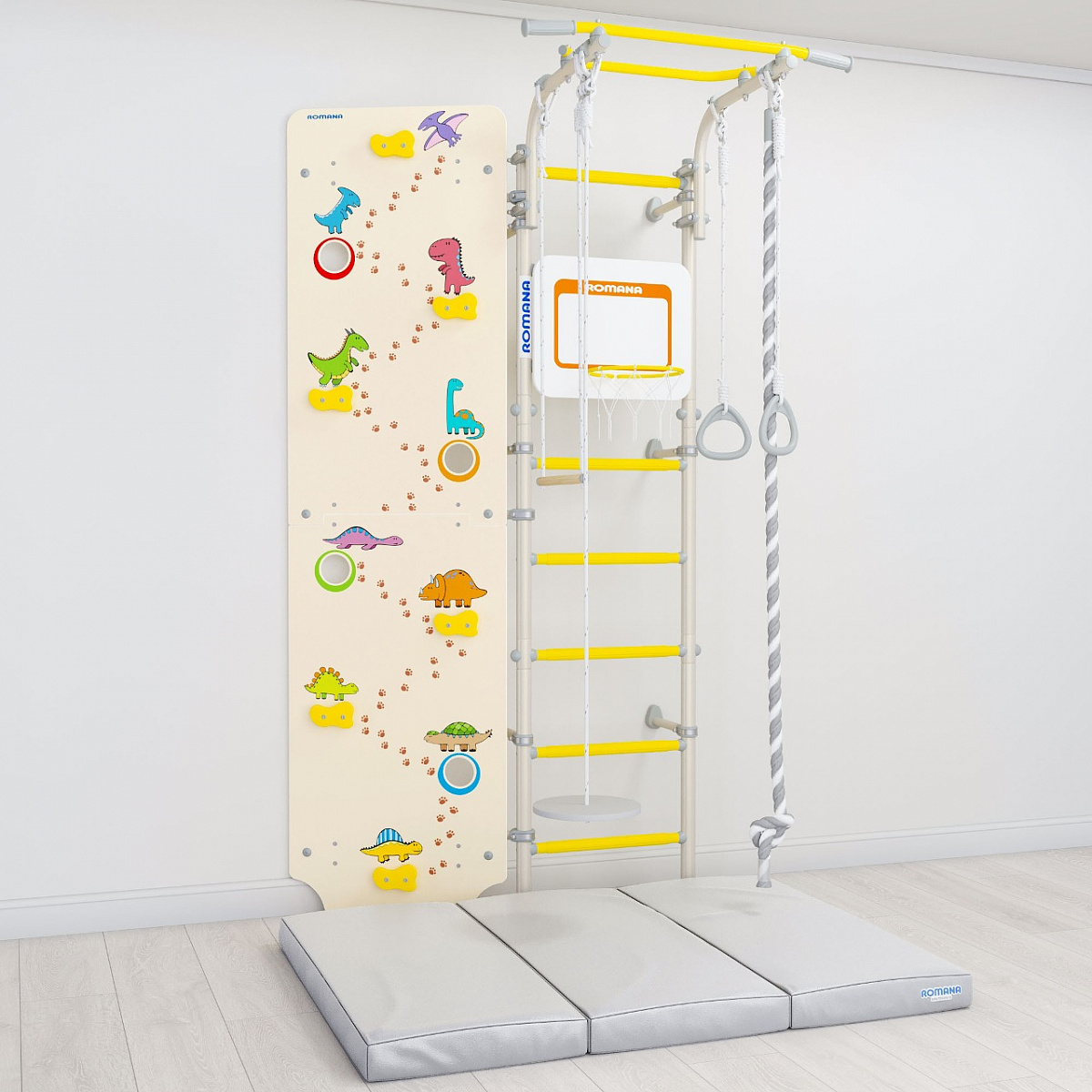 Шведская стенка представляет собой полноценную игровую зону, и включает всевозможное дополнительное оборудование: кольца, канат, подвес, скалолаз и трапеция. Безопасность во время активного досуга обеспечивает мат толщиной 100мм. Благодаря складной конструкции, мат легко разложить или убрать. Подвижный турник можно регулировать, в зависимости от роста человека. В комплект также входит баскетбольный щит. Обилие элементов позволяет обеспечить всестороннее физическое развитие.